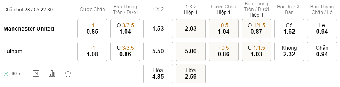 Tỉ lệ kèo MU vs Fulham