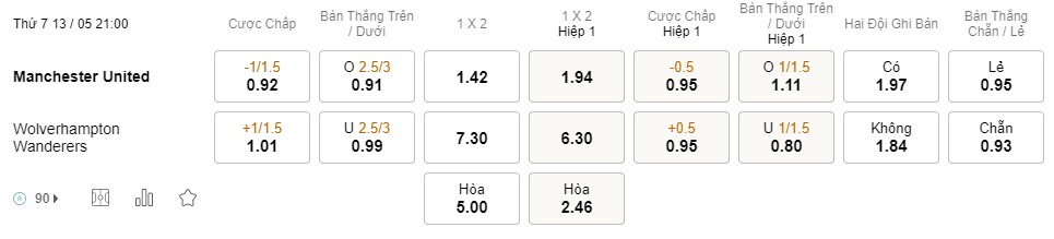 Tỉ lệ kèo MU vs Wolves