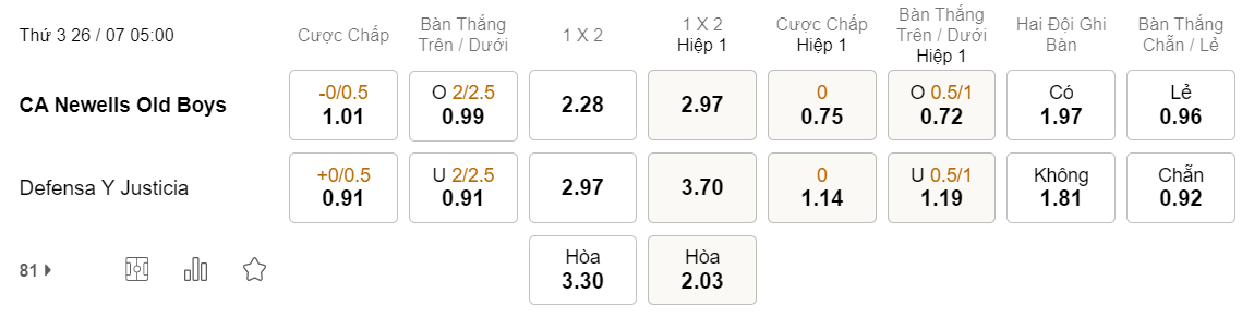 Tỉ lệ kèo Newells Old Boys vs Defensa Justicia