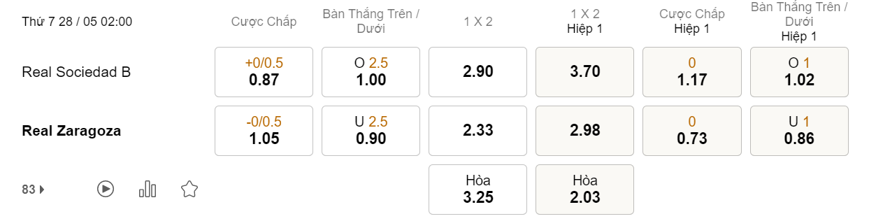 Soi kèo hiệp 1 Real Sociedad B vs Real Zaragoza: 1.17*0*0.73