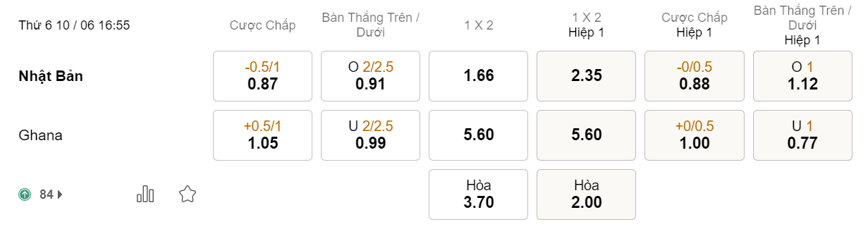 Tỉ lệ kèo Nhật Bản vs Ghana