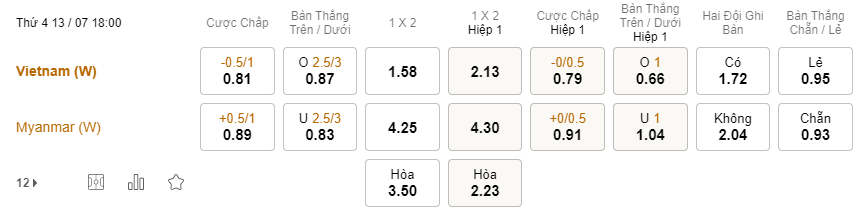Tỉ lệ kèo Nữ Việt Nam vs Nữ Myanmar