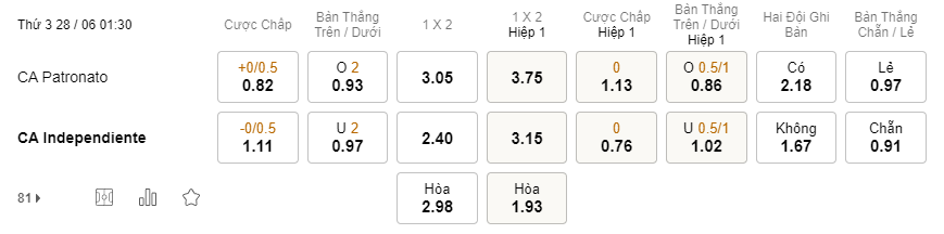 Soi kèo Châu Á Patronato vs Independiente: 0.82*0/0.5*1.11