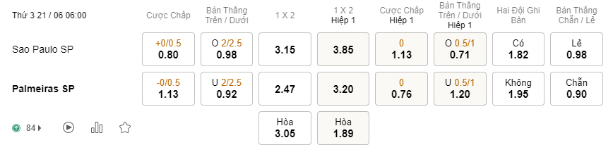 Soi kèo châu Á Sao Paulo vs Palmeiras: 0.80*0/0.5*1.13