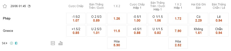 Tỉ lệ kèo Pháp vs Hy Lạp