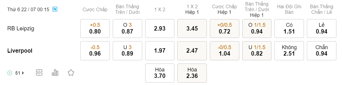 Soi kèo hiệp 1 RB Leipzig vs Liverpool: 0.72*0/0.5*1.04