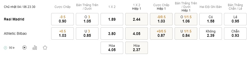 Soi kèo châu Á Real Madrid vs Bilbao: 0.90*0.5*1.03