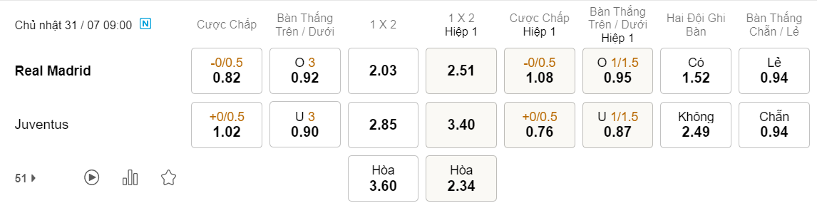 Soi kèo châu Á Real Madrid vs Juventus: 0.82*0/0.5*1.02