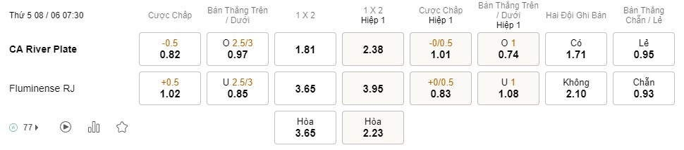 Soi kèo hiệp 1 River Plate vs Fluminense: 1.01*0/0.5*0.83