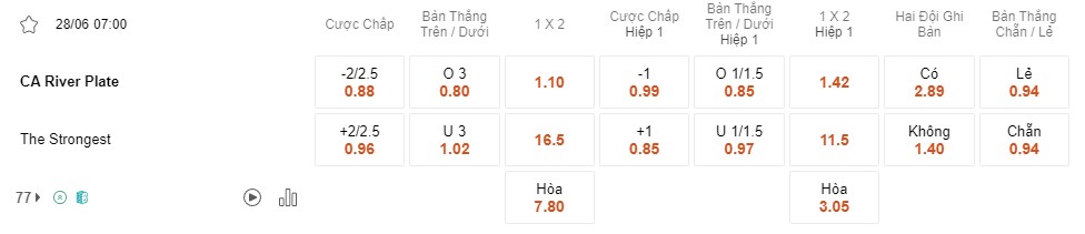 Tỉ lệ kèo River Plate vs Strongest