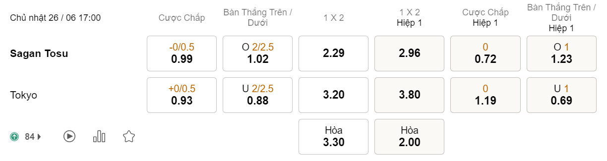 Soi kèo hiệp 1 Sagan Tosu vs FC Tokyo: 0.72*0*1.19
