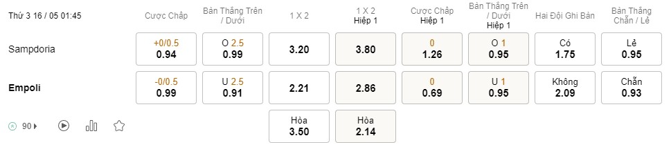 Soi kèo châu Á Sampdoria vs Empoli: 0.94*0/0.5*0.99
