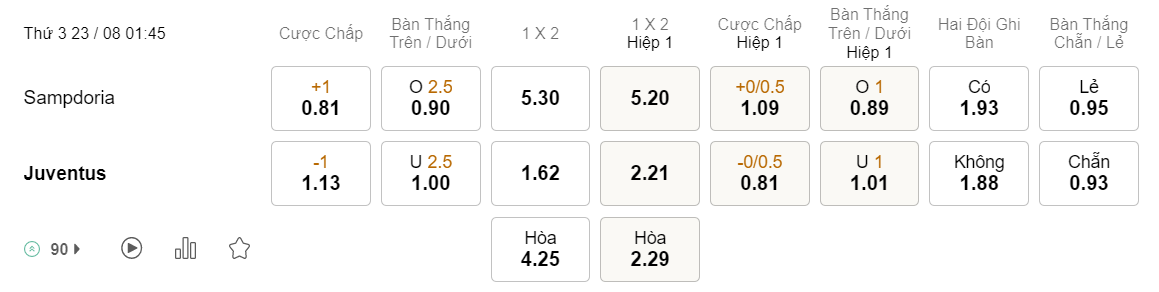 Soi kèo hiệp 1 Sampdoria vs Juventus: 1.09*0/0.5*0.81