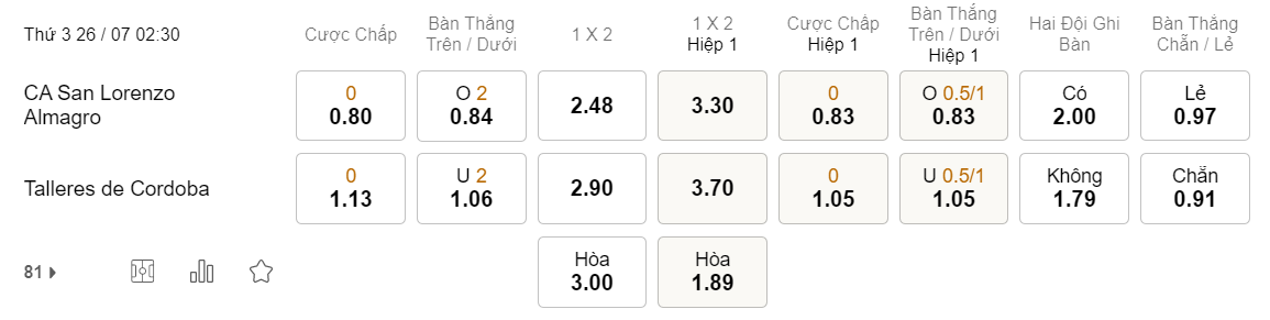 Tỉ lệ kèo San Lorenzo vs Talleres