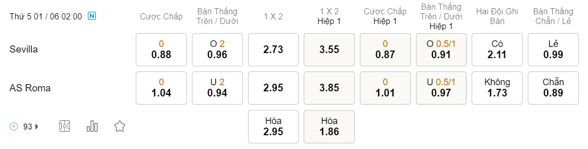 Soi kèo châu Á Sevilla vs Roma: 0.88*0*1.04