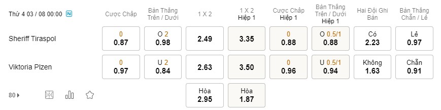 Mặc dù đang có phong độ khá ổn định, tuy nhiên Sheriff lại thường chơi rất thận trọng trong hiệp 1. Theo thống kê, 2/3 trận gần nhất đội bóng này chỉ có thể tìm được đường vào khung thành đối phương ở nửa sau của trận đấu. Trong khi đó, 3/5 trận gần nhất, Viktoria Plzen đã giữ sạch lưới trong 45 phút đầu tiên. Vì vậy, khả năng cao hiệp 1 cuộc chạm trán này sẽ khép lại với kết quả hòa không bàn thắng.