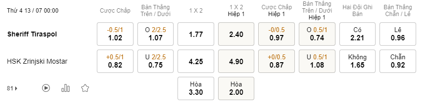 Tỉ lệ kèo Sheriff vs Zrinjski