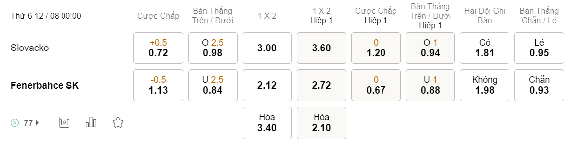 Tỉ lệ kèo Slovacko vs Fenerbahce
