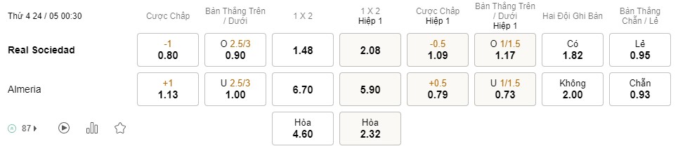 Soi kèo tài xỉu Sociedad vs Almeria: 0.90*2.5/3*1.00