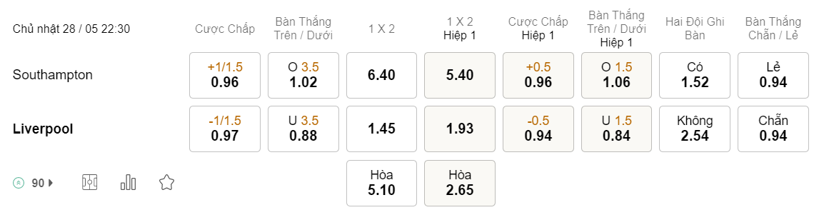 Tỉ lệ kèo Southampton vs Liverpool