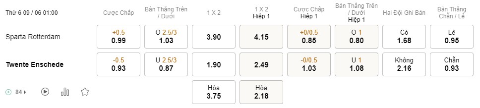 Soi kèo châu Á Sparta Rotterdam vs Twente: 0.99*0.5*0.93