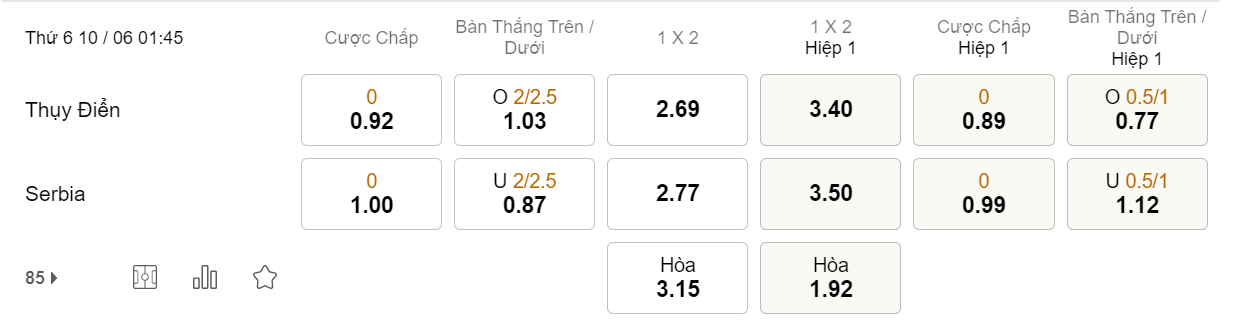 Tỉ lệ kèo Thụy Điển vs Serbia