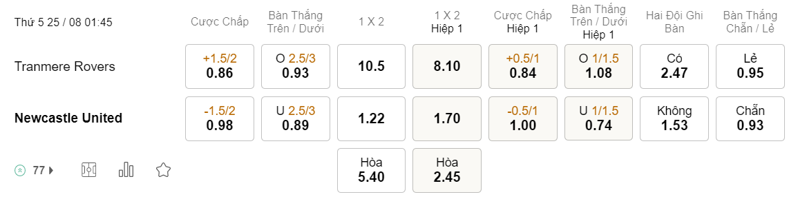 Nhận định, soi kèo Tranmere vs Newcastle lúc 01h45 ngày 25/08/2022