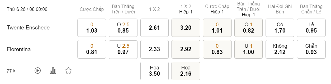 Soi kèo hiệp 1 Twente vs Fiorentina: 1.01*0*0.83