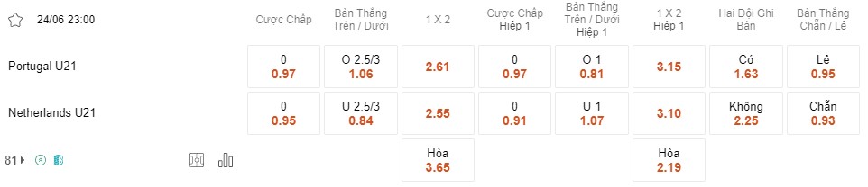 Tỉ lệ kèo U21 Bồ Đào Nha vs U21 Hà Lan