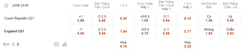 Tỉ lệ kèo U21 Czech vs U21 Anh