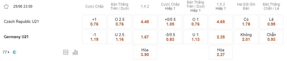 Tỉ lệ kèo U21 Czech vs U21 Đức