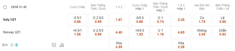 Tỉ lệ kèo U21 Ý vs U21 Na Uy