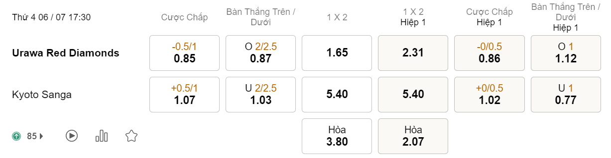 Soi kèo châu Á Urawa Reds vs Kyoto Sanga: 0.85*0.5/1*1.07
