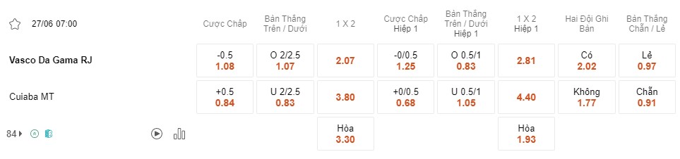 Tỉ lệ kèo Vasco da Gama vs Cuiaba