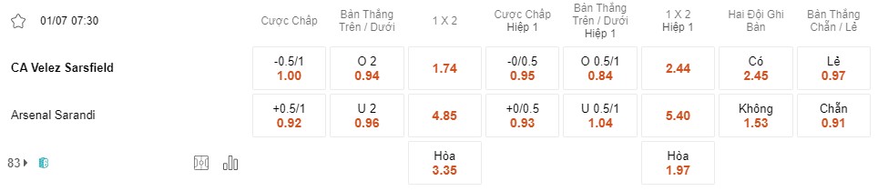 Tỉ lệ kèo Velez vs Arsenal
