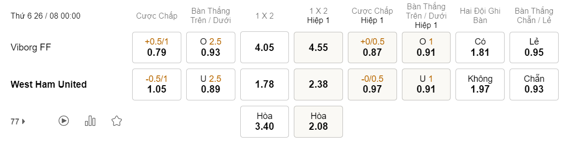 Soi kèo châu Á Viborg vs Westham: 0.79*0.5/1*1.05