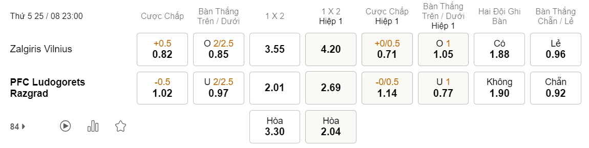 Soi kèo hiệp 1 Zalgiris vs Ludogorets: 0.71*0/0.5*1.14