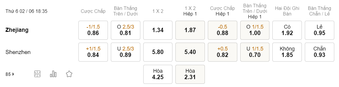 Tỉ lệ kèo Zhejiang vs Shenzhen